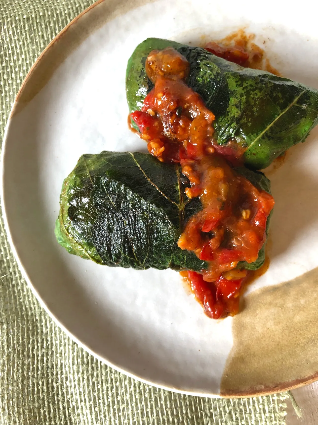 But I did find a couple of other things: Stuffed zucchini leaves - Urban Farm Foods - this is for the principle rather than the recipe itself because you can stuff them with whatever you like; and Zucchini stem pasta - Heirloom at Home - which is not really pasta but in which the guy used the stems from the big leaves, removed the fibres within like you do with celery or rhubarb, and then cut them into pieces to look like green rigatoni. It looked quite good - and infinitely variable as to what you added in as extras - he added bacon and actual charred zucchini.