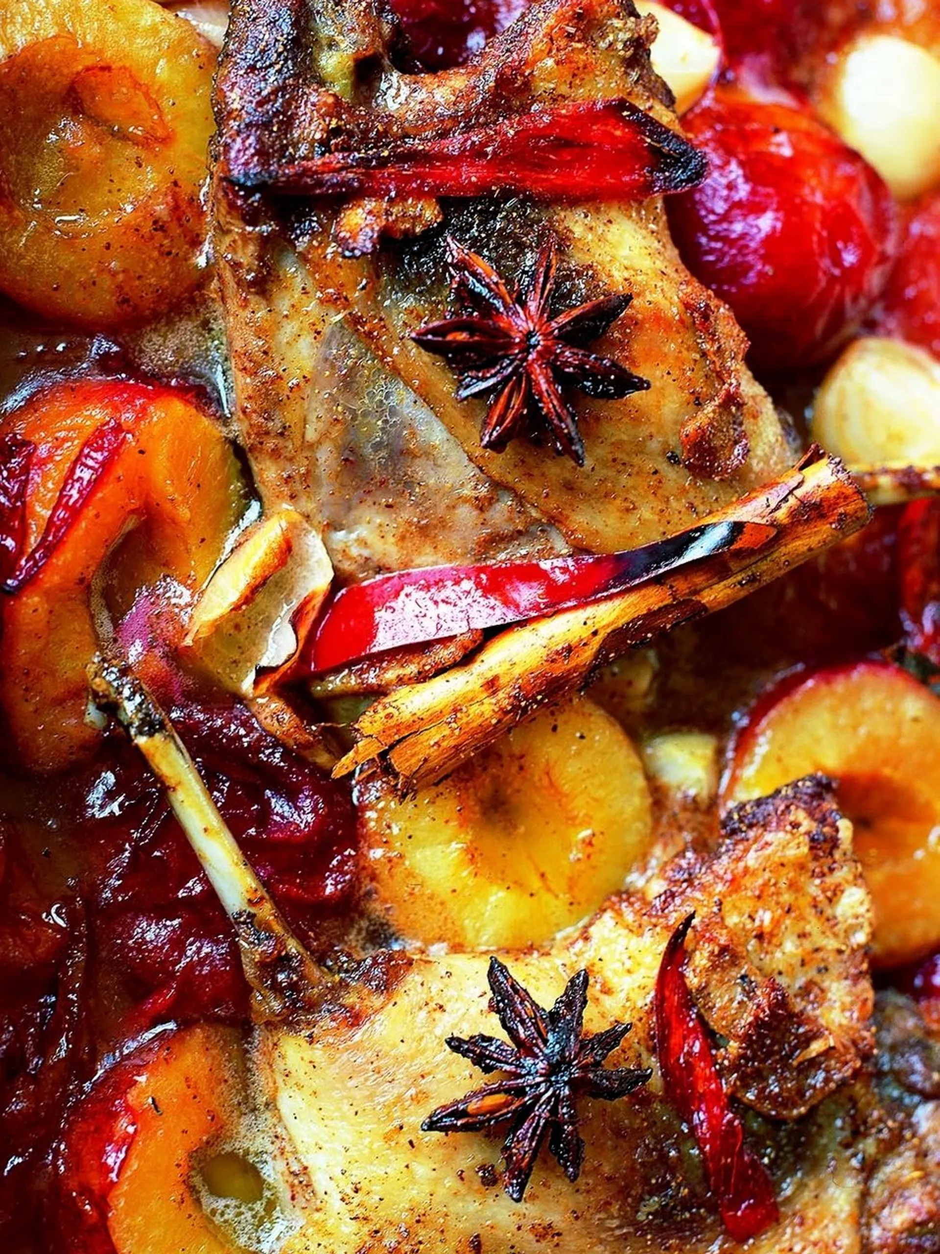 Most of the others that I found were variations of roast duck with various fruits, and or variations on Peking duck, so I've picked just three - Duck confit with shallots and pomegranate - Yotam Ottolenghi - he is not alone with this combination; Duck maryland jungle curry - Charlotte Binns-McDonald/delicious.; and Sweet duck legs cooked with plums and star anise - Jamie Oliver