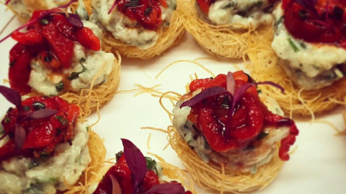 Ottolenghi has a recipe for Aubergine kadaifi nests with red pepper and tomato salsa - his are stuffed with a creamy eggplant concoction and then baked. But interestingly I also found a version of the recipe on a CBS website, with appears to have made the nests, into mini tarts, filled them with the eggplant mix and with a more solid kind of topping than the salsa he describes. Which just goes to show you can take one template technique - a covered roll and convert it into a mini tart - which, of course could be appled to the other templates too.