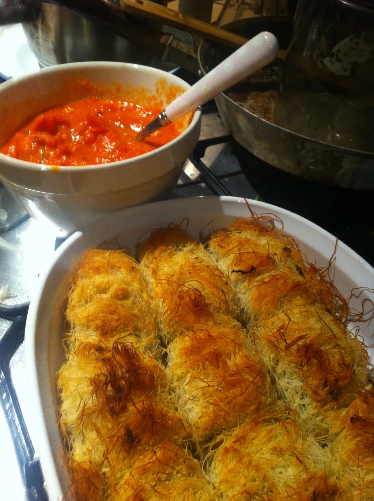 "kataifi begins as a light, pourable batter which is streamed through fine nozzles on to a rotating heated plate, where it cooks almost instantly into a cascade of fine vermicelli-like strands, delicate yet strong, like spun silk." Alice Zaslavsky