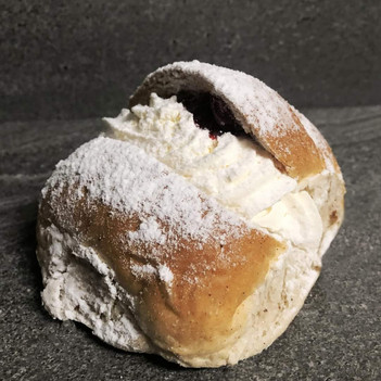 As always, one thing leads to another and one of these people - I now can't remember who, told me that Scandinavia and particularly Sweden with its Semlor - as demonstrated on the website What's for Lunch Honey? have a whole range of varieties of cream bun - laskiaispulla (Finland), fastelavensbolle (Norway), fastelavnsbolle (Denmark), vastlakukkel (Estonia) where, like the maritozzi they are a Lenten thing. The traditional version has a marzipan like filling, on which the lid of the bun and then cream are balanced. The recipe I chose to represent this particular kind of cream bun went for jam rather than marzipan - from the What's for Lunch Honey? website.