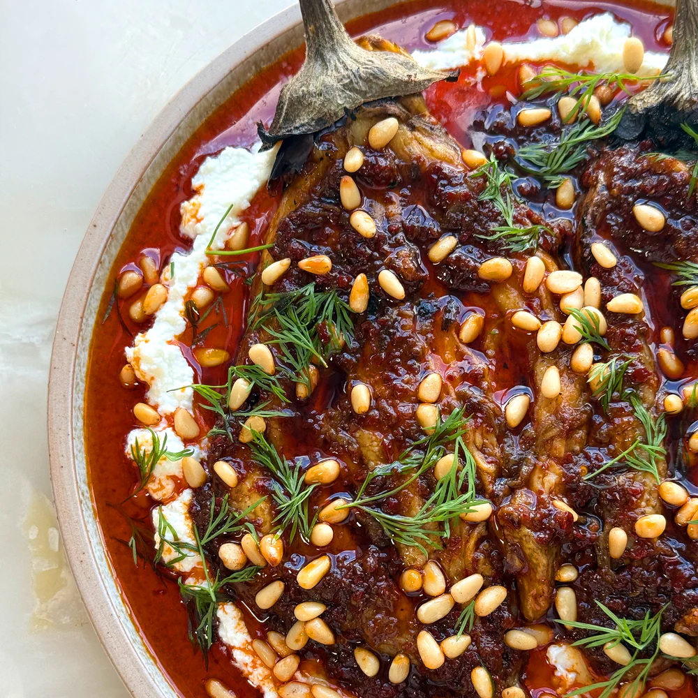 "the composition is inspired by Yotam Ottolenghi’s unbeatable formula of flavoured yoghurt base + roasted aubergines + vibrant toppings." Ixta Belfrage
