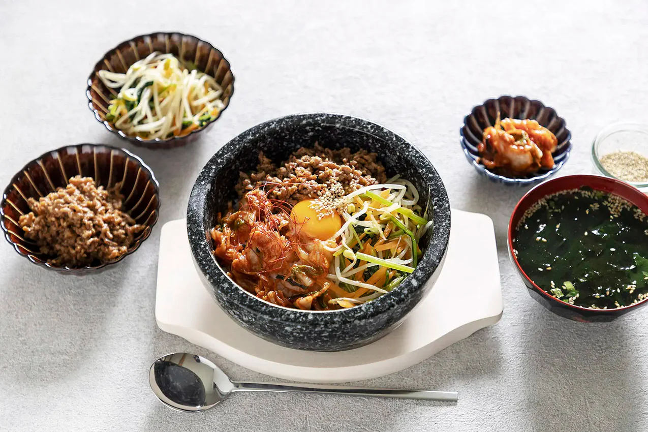 "Bibimbap is usually served in a metal bowl, although the ‘dolsot’ version is named after the — heated — stone pot it’s served in. Originating during the Three Kingdom period (57 BC to AD 668) from the pot used to cook rice over charcoal in centuries past, particularly for royalty, this style of bibimbap is more of a restaurant speciality than a home dish. The technique came close to disappearing during the Japanese occupation (1910-1945), but was reintroduced in restaurants in the 1960s. Repackaging bibimbap in this way was seen as a way to reverse a decline in customer numbers following the Korean War." National Geographic