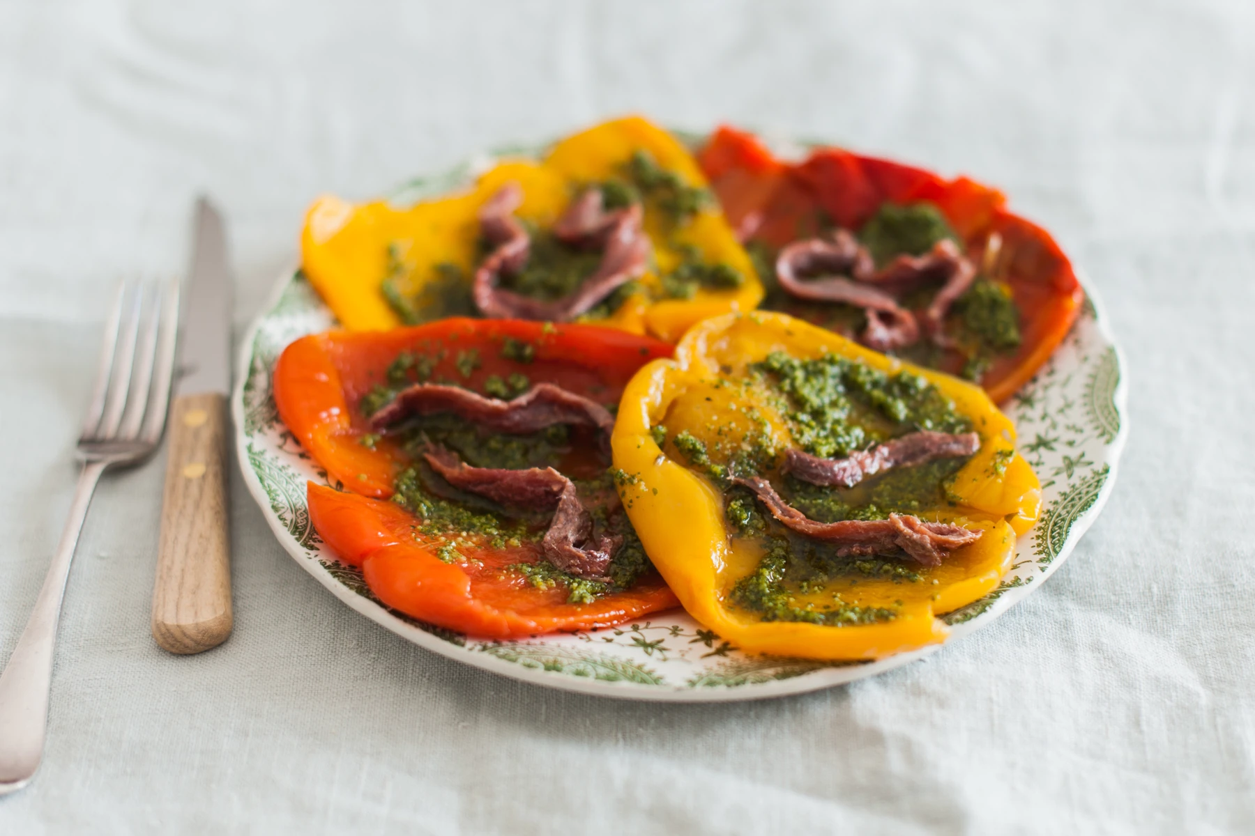 I really do wonder whether the 'real' stuffed Piedmontese peppers are focussed on the anchovies however, because - not only did the Memorie di Angelina guy exclude the tomatoes, but when I checked my Italy the Beautiful Cookbook, the only version there was just anchovies - plus a few capers, some garlic and some oregano. No recipe online - but, like virtually all of them it's hardly a recipe although interestingly it tells us to roast the peppers, then slice them into strips and dress with the roughly chopped anchovies, capers, garlic and oregano. However the picture implies, no slices, and that possibly the anchovies and other things were cooked with the peppers. A little mysterious. And finally I found Peperoni all'Aciugga -from Valeria Necchio/Great Italian Chefs who roasts and peels her peppers, cuts them in half, and then dresses them with a salsa verde which includes parsley, garlic, capers, bread and vinegar, with the whole thing being topped with some anchovy fillets. Looks classy.