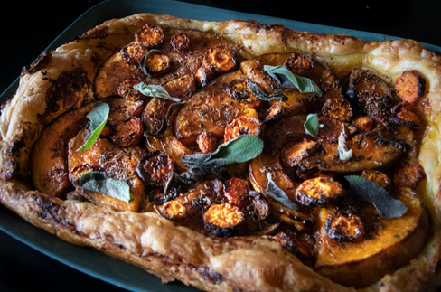 The pastry - is a sort of rough puff pastry that includes polenta, sage, caraway seeds and olive oil. So it's a tiny bit more complicated to make and you also have to rest it, but it's apparently pretty easy to work with. The pumpkin and carrots need to be roasted - together with a whole garlic bulb and a shallot - and more sage.