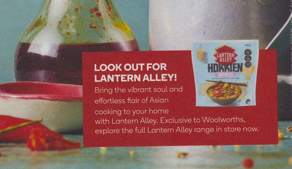 However, I now see that - tucked away in the corner of this section on noodles - quaintly called 'Noodle on This' is a promotion for what is obviously a Woolworths product - Lantern Alley noodles. Another example of the new kind of home brand product - à l'Aldi - which does not feature the Woolworths name. So each recipe in the section features a different kind of noodles produced by as this brand - although none of the other recipes mentions a particular national inspiration - they are more generic.
