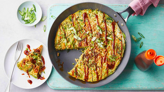 The idea of a noodle pancake is a good one however, and there are a few others. Coles goes the 'inspired' way with their Japanese-inspired noodle pancake; a website called Fresh Approach Cooking has Rice noodle pancakes - which in keeping with this sort of dish is a sort of fridge-raid thing, and then there's Vegetable noodle pancake - from Silvana Franco/BBC which has a nod to that Japanese thing of the lines of sauce over the top.