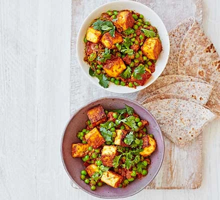And then there is, of all people, Charmaine Solomon who does a Mattar panir - peas and fresh cheese on the Charmaine's Kitchen website - alas no picture It's a kind of cheat's version in that it uses her brand of Butter Chicken marinade, so it really is a butter matar paneer dish rather than the traditional one anyway. I include it however, because she uses ricotta which she bakes in the oven, until firm and golden, rather than paneer. Well ricotta is basically the same as paneer, but is soft. You weight the curds for paneer so that it becomes harder. A curiosity.