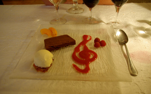 I will end with love and with memory however. A memory stimulated by the Getty photograph of a stunning looking dessert at the top of the page, which features the musical symbol of the double clef - the symbol found on musical manuscripts at the beginning of a piece of music. I'm not sure why it is so beloved of dessert platers, but it certainly is. As it was for a memorable meal at this fairytale hamlet of Thorrenc in the Ardèche region of France. In the middle of nowhere. We stayed at a B&B here with a reputation for good food on the penultimate day of one of our holidays in France. On the way there, there had been the inevitable spats in the car, because this was possibly the most difficult place to find on all of our travels. Down narrow hilly roads seeming to go nowhere. And it was raining too. Anyway the place was lovely and so was the food although, alas it had to be eaten inside because of the rain. And dessert came with that double clef, perhaps not such an accomplished one. Just David and I, La France Profonde and la Cuisine Française. But no music other than the rain pattering on the roof and the double clef. Mayabe it's a reminder that life is sweet and like a beautiful piece of music.