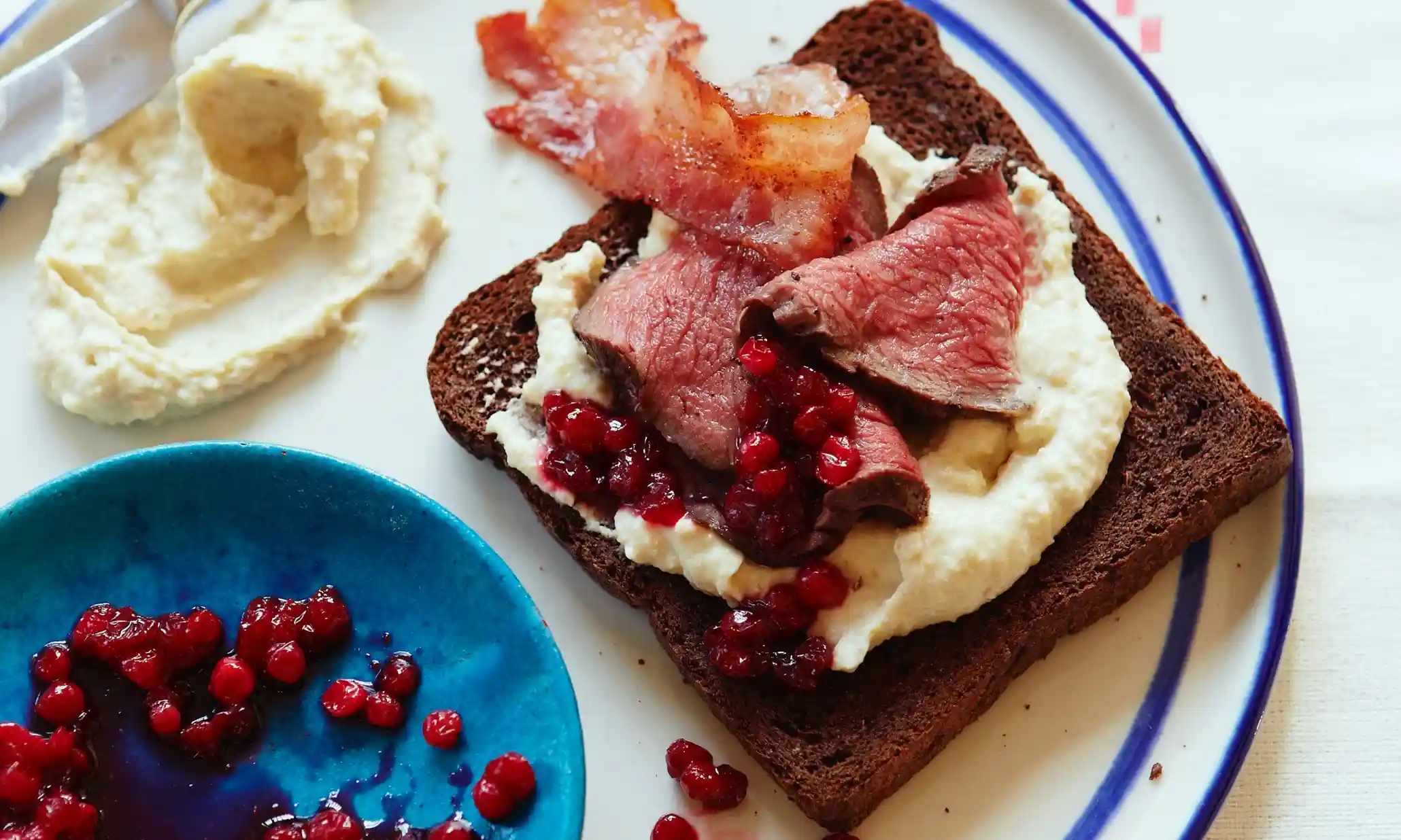 Finally still with the sweet - cloudberries - such a poetic name for such a beautiful looking fruit, which alas, my Time/Life man described as having "a flavour perhaps of moss". Sounds poetic too, but maybe not tasty. Then there are the lingonberries, found all over Scandinavia - made into jam, and sometimes found with savoury things, like this gorgeous looking venison sandwich with bacon, chestnut creme fraiche and lingonberry jam/Matthew Young/Wild Food Market.