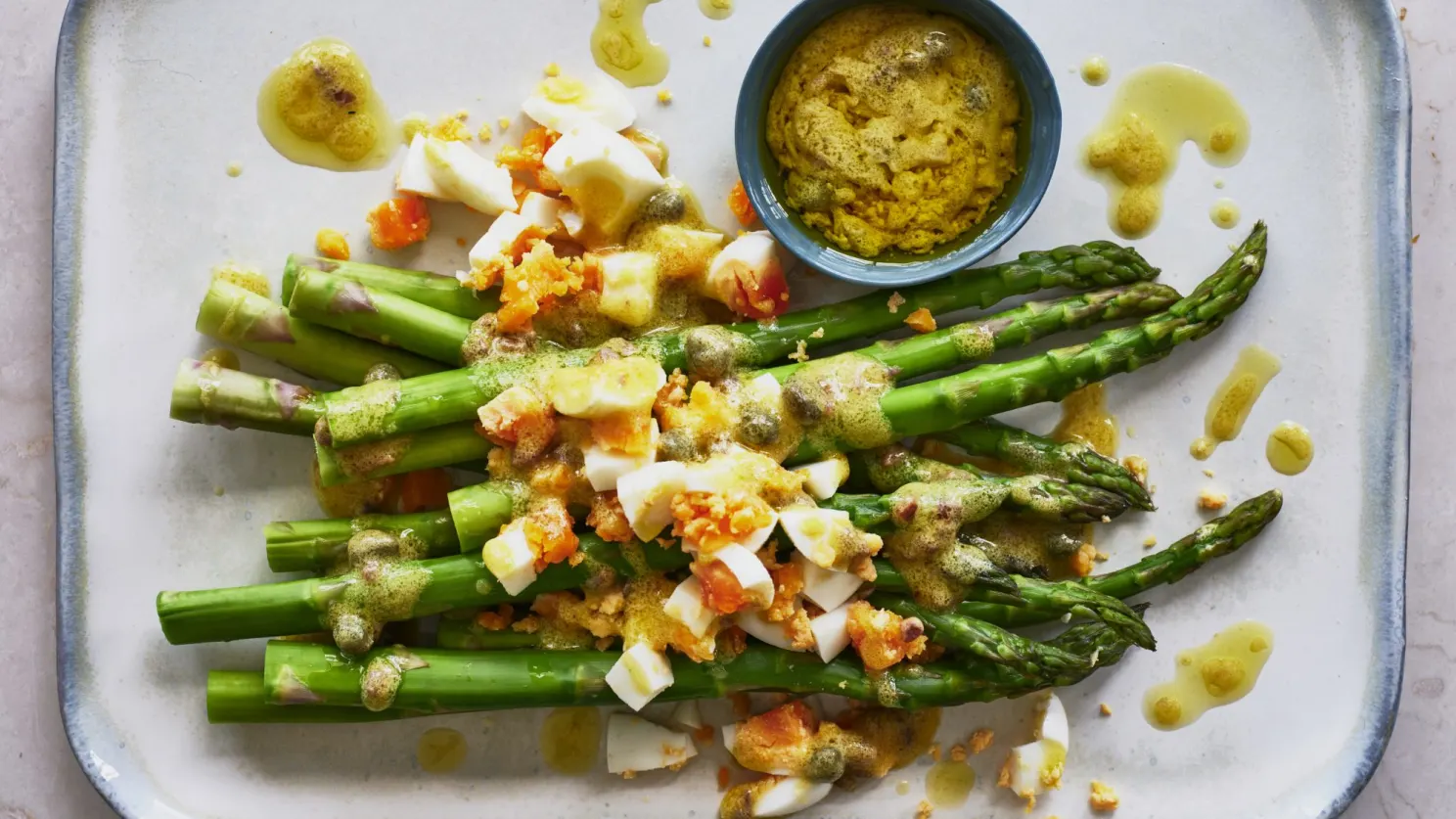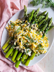 The others are more varied: Asparagus mimosa - Olive and Mango - whose author pushes her egg through a sieve and adds capers and fried prosciutto to the mix David Lebovitz also adds capers, to his Asparagus mimosa but is fairly minimalist with his vinaigrette and the eggs and parsley, which are just chopped and relatively sparse; Asparagus mimosa with caper vinaigrette from Big Delicious Life is also fairly standard although she uses champagne vinegar and the herbs are dill and chives; our own Adam Liaw on the Good Food website adds the chopped eggs to the vinaigrette and pours the whole lot over his Asparagus with chopped egg vinaigrette; and Ottolenghi, maybe surprisingly, has the most classic version of all - no vinaigrette just olive oil, eggs, and capers - the picture is from his book Plenty - the recipe from Milliemirepoix. And as, you can see they all look pretty similar. I would say, guess for yourself how much egg you want and how fine you want it to be.