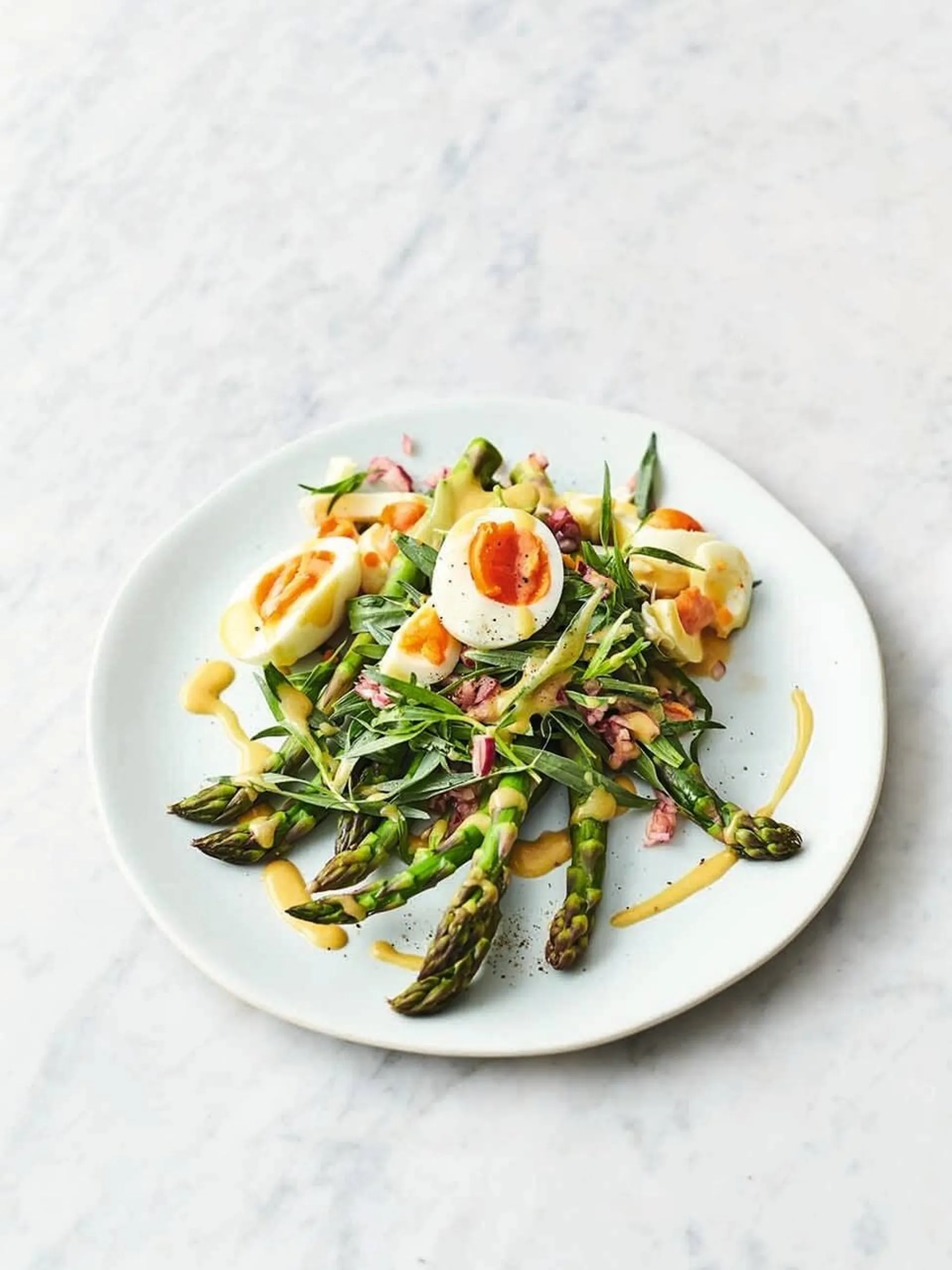 Jamie had two variations. In the first Asparagus, eggs and French dressing he sort of simplifies the idea by not chopping the eggs, and also keeping them slightly under hard-boiled, and adds tarragon to the dressing. The second is Tender asparagus which has a vinaigrette dressing with the addition of blitzed spring onions - hence the green colour - plus some crispy bacon and croutons to contrast with the hard-boiled egg.