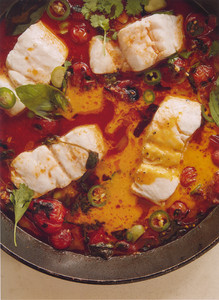 Most of my friends and family seem to think that I'm a wonderful cook but what does that mean? Because the dishes that I cook for them which provoke that praise are usually dishes I have made from recipes. I have just followed the recipe and so the result really depends on how good the recipe is. If it's wow as in Ixta Belfrage's Fish poached in charred tomato broth, shown here then really I can't take the praise. Anyone who can read can do it. Although, I must admit that, when you look at other people's attempts at this - and I include myself in this - see below's pretty awful photograph - we may not get it quite right along the line. Different ingredients, different pots, different stoves, a bit of distraction ... But also bear in mind that the picture from the cookbook has been styled and the photo taken by a professional photographer. Who knows whether the original was really as red as that, rather than the sludgier orange of mine? They probably took dozens of photos before they got it right too. Nevertheless I do remember that the taste was just wow. And you too - anyone - can reproduce it - near enough anyway.
